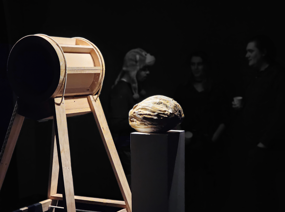 The centrepiece is incredible. A dark room, painted black, featuring a dozen speakers surrounding what Danny Lam described as a pommel horse, the unique wooden structure that suspended a pile of clay at shoulder height during the creation, and a finished sculpture formed from quick-set plaster poured into the clay before being pried free from it.