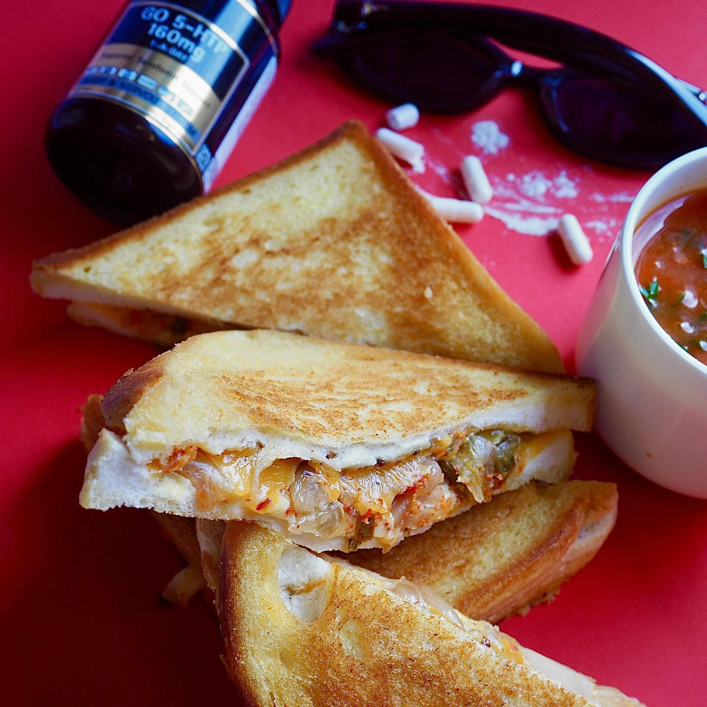 In Between the two slices of bread add the kimchi, cheese, S+P, sprinkled contents of a 5 HTP capsule (if using) and microwave for 1 min or until the cheese is starting to melt.