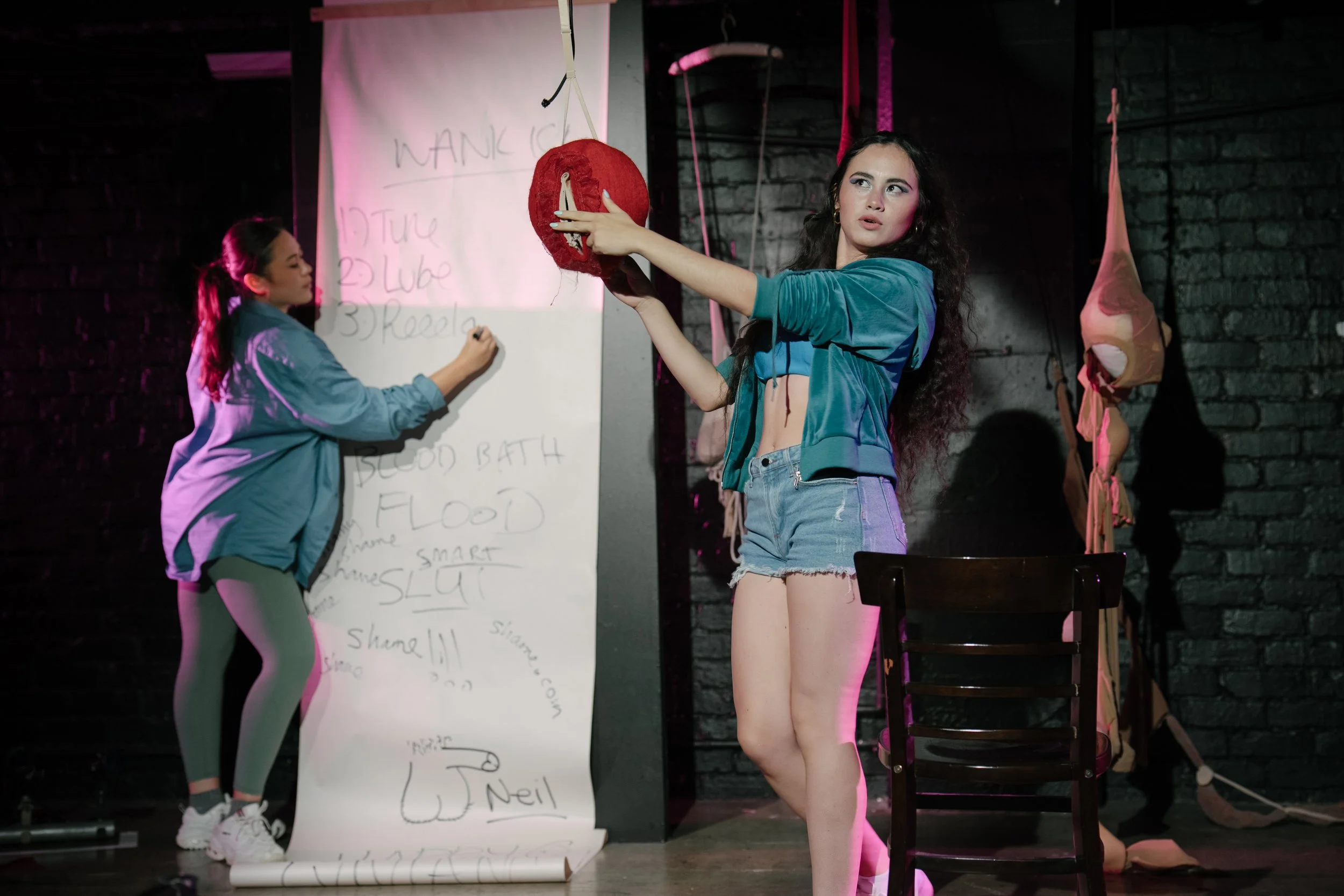 The use of traditional feminine markers as stage props were interesting to me: pink coloured pantyhose and red bras hung from the ceilings like stalactites, congealed together in a Cronenberg-esque landscape. I knew what the performance was about, but walking into the theatre and immediately seeing this almost body horror set-up framed the narrative in a different light. The typical notion of women’s bodies as soft and delicate was redefined as a dripping, chaotic landscape of pink and red. The stage design also encompassed so much of what it feels like to be a woman, of being trapped inside a body that dictates your entire worth - but what happens when this body rebels against you?